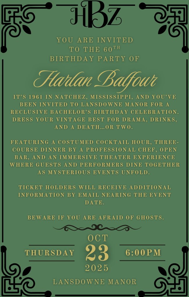 Foul Play at Lansdowne Manor is a one-night-only deadly dinner drama played out over an evening of fine dining, Southern scandal, and intoxicating spirits…in more ways than one.
