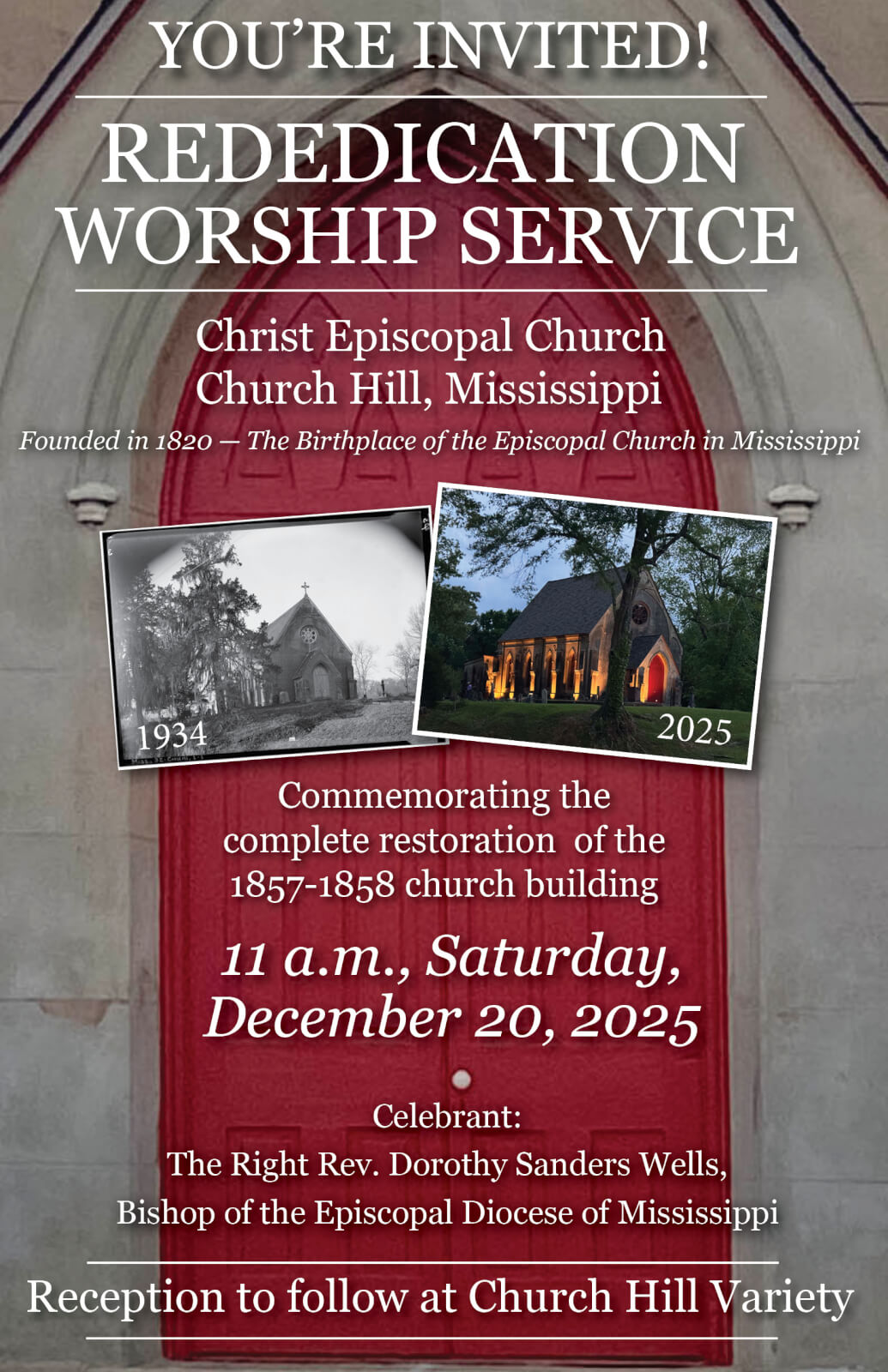 Christ Episcopal Church, dating to 1820, will have its 1858 church building rededicated to the glory of God, following a total restoration. Bishop Dorothy Sanders Wells will be celebrant. A reception will follow at Church Hill Variety.