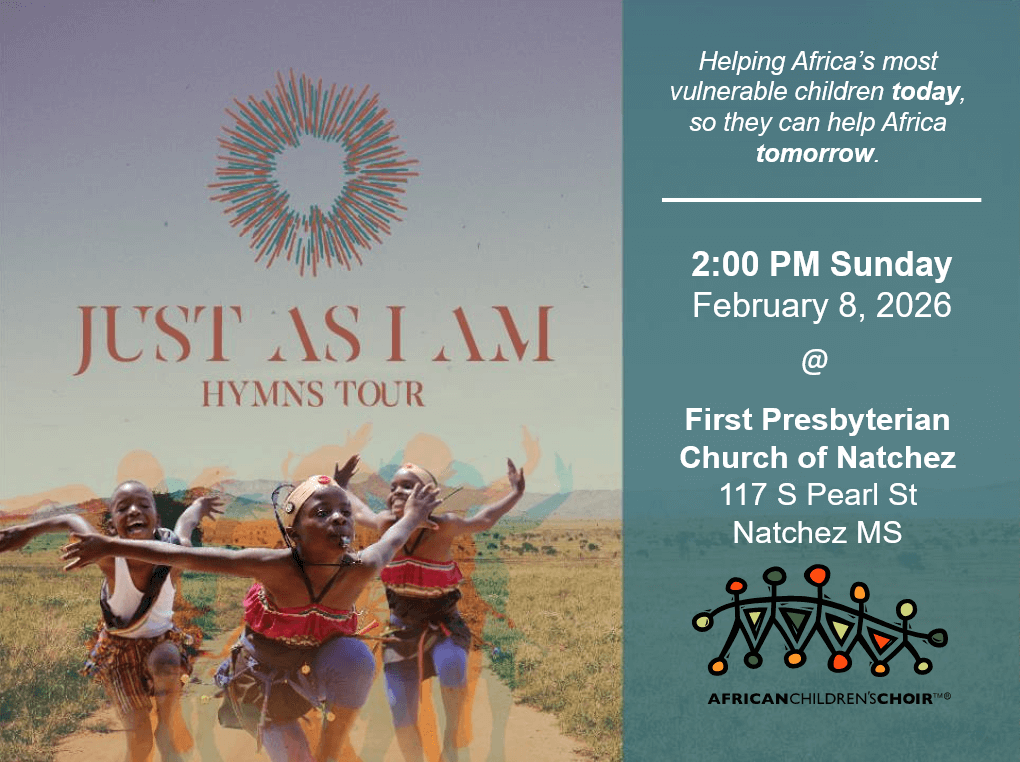 First Presbyterian Church of Natchez invites you to a special concert presented by the African Children’s Choir – Just As I Am Hymns Tour 2:00 PM Sunday, February 8th, 2026.