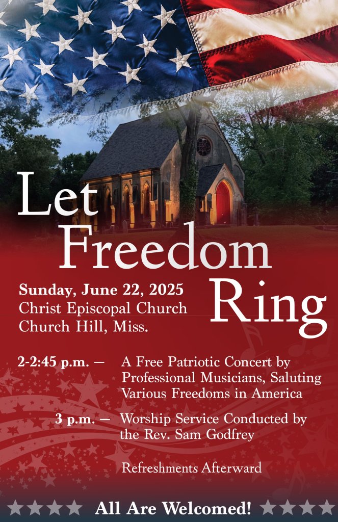 The concert will be held on June 22, 2025 beginning at 2:00 p.m. at Christ Episcopal Church in Church Hill, 15 miles north of Natchez on MS Highway 553.