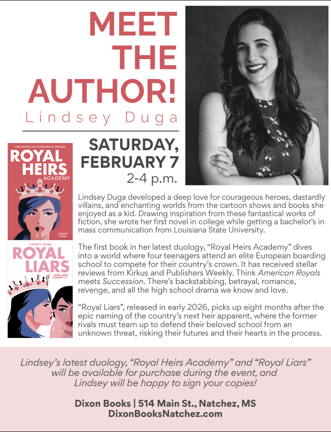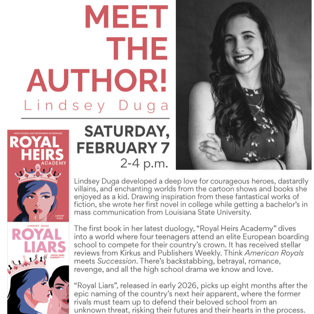 Join us as we welcome Young Adult author Lindsey Duga from Baton Rouge! She’ll be signing the final book in her high-stakes contemporary duology, “Royal Liars.” This new release, as well as its prequel “Royal Heirs Academy”, will be available for purchase during the event.