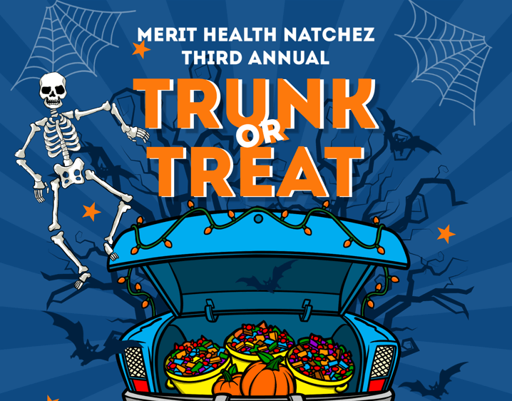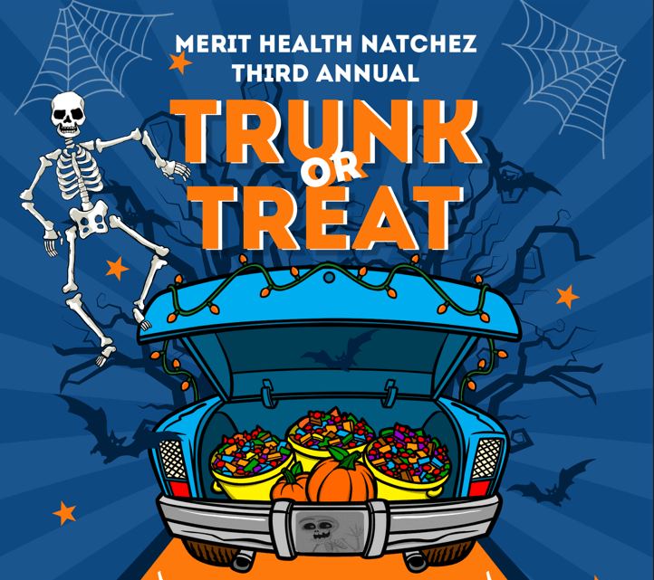 Merit Health Natchez is pleased to offer our Third Annual Trunk or Treat. Join us for a night of spooktacular fun, food, treat bags and of course, candy! We will have over 12 trunks decorated for your enjoyment. Join us from 5:30 pm – 7:00 pm in the parking lot of Merit Health Natchez.