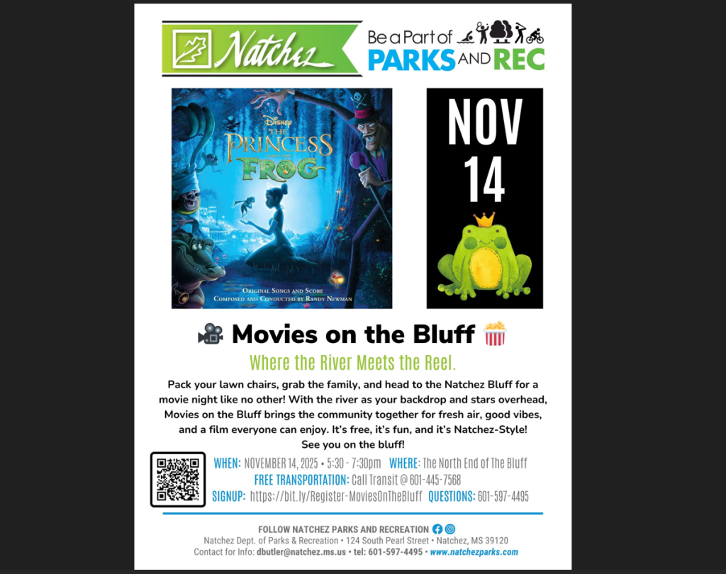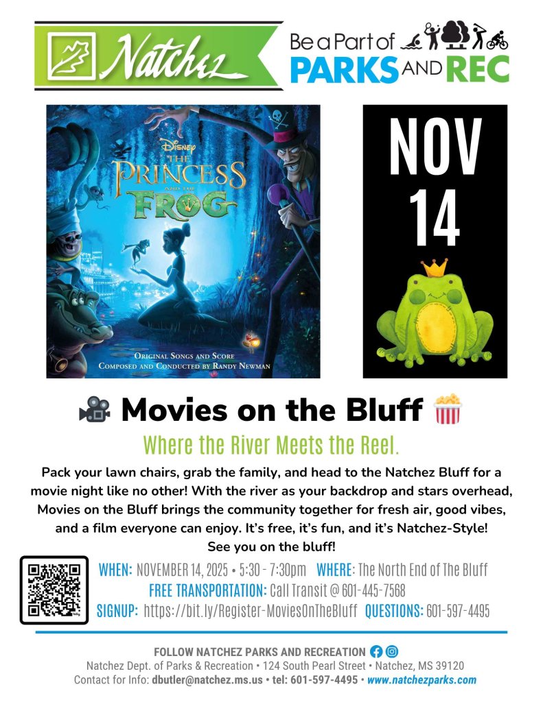 Movies on the Bluff is a free outdoor film series held on the Natchez bluff, where the views stretch wide over the Mississippi River and the sunsets steal the show before the opening credits even roll. Locals and visitors alike bring chairs, blankets, and snacks to enjoy a laid-back evening under the stars. It’s family-friendly, community-driven, and pure Natchez—where the backdrop is just as memorable as the movie.