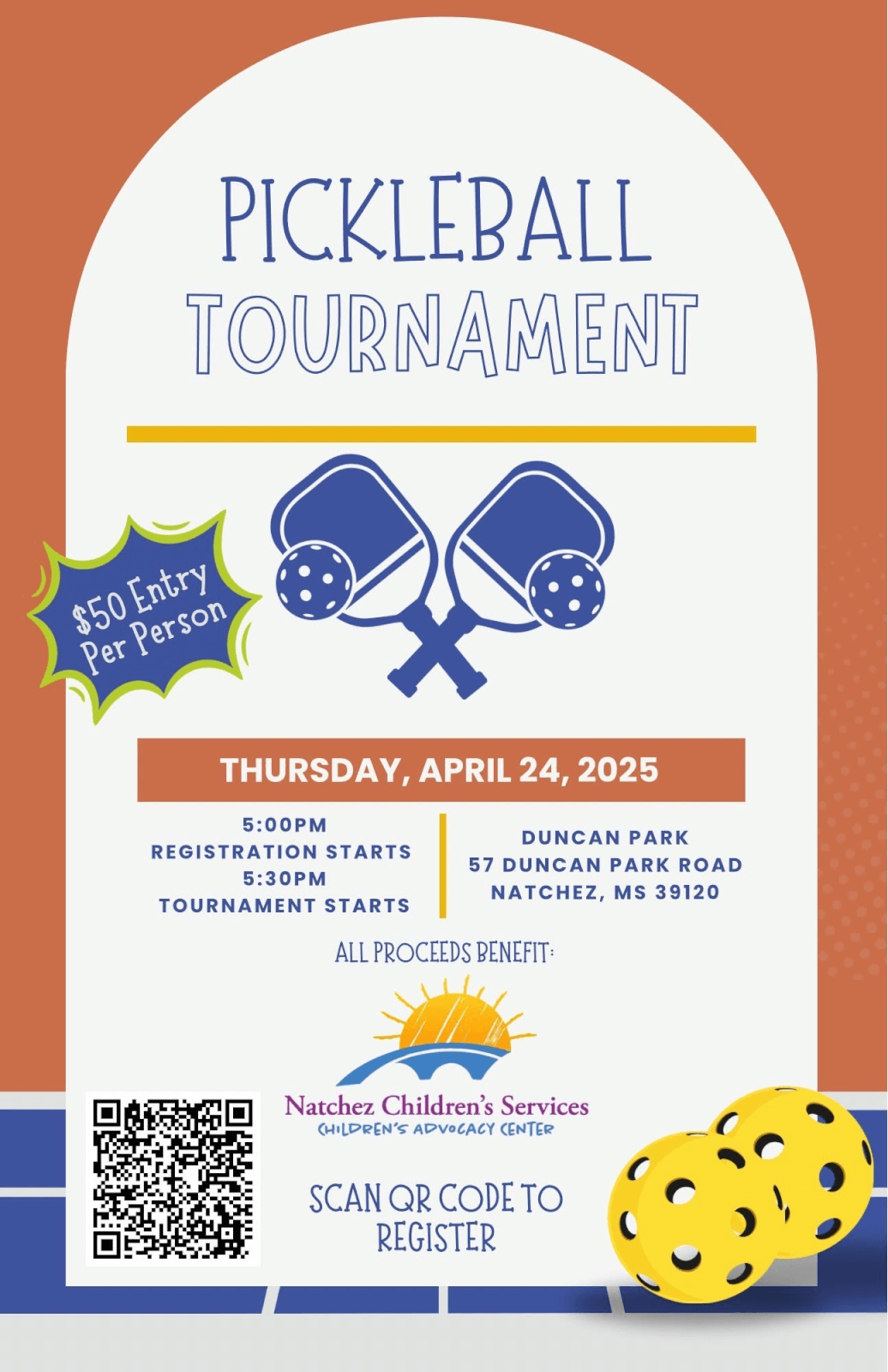 Join us for a day of fun, friendly competition, and community spirit at the Natchez Children’s Services Annual Pickleball Tournament! Grab your paddles and rally for a great cause while enjoying delicious muffins and mimosas, included for all players. 🍾 Alcoholic beverages will be available for purchase. 🎟 Exciting raffle prizes up for grabs! Your participation helps support the vital programs of Natchez Children’s Services, making a difference in the lives of children in our community. 📍 Location: Duncan Park 📅 Date & Time: April 24th at 5:30pm 💰 Registration: BonTempsTix or register day of! (Online: https://bontempstix.com/events/natchez-childrens-services-annual-pickleball-tournament-4-24-2025) Whether you’re a seasoned player or new to the game, come out for a day of fun and philanthropy! Sign up today and let’s serve up some support! 🎾✨