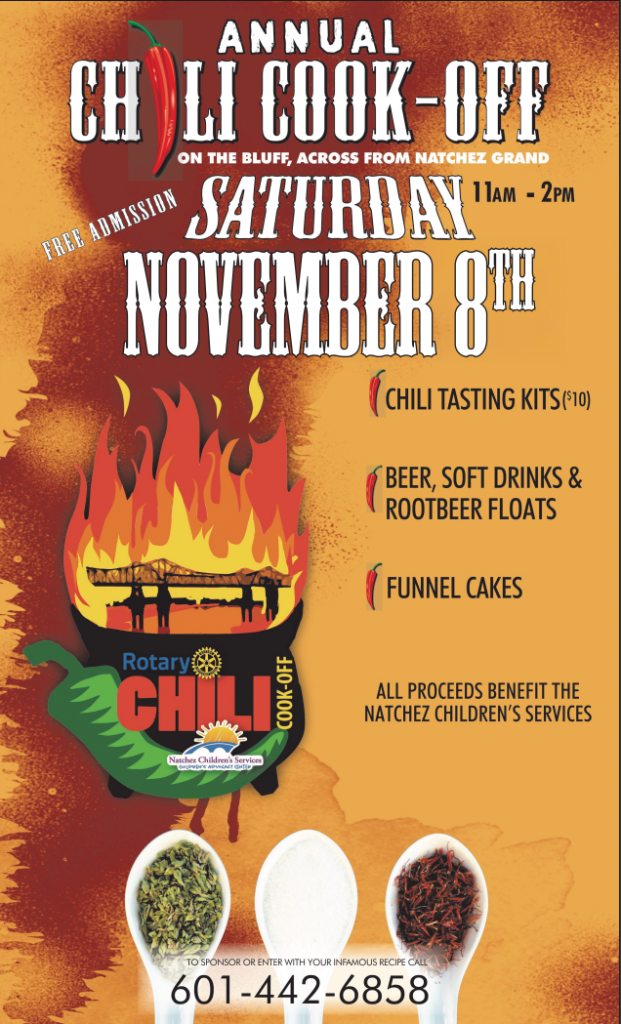 The Rotary Club of Natchez Chili Cook-Off will be held on Saturday, November 8, 2025 from 11:00 AM to 2:00 PM on the Natchez Bluff across form the Grand Hotel.