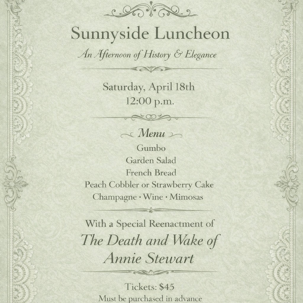 Sunnyside Luncheon on Saturday, April 18th at 12:00 pm. Guests will be treated to a delicious meal prepared by Colleen Wilkins, followed by a moving reenactment of the Death and Wake of Annie Stewart. Having come to Natchez with dreams of marriage and a heart full of devotion, Annie’s story of love was heartbreakingly cut short by fate. Her gentle yet tragic tale—woven with romance, hope, and sorrow—will be tenderly brought to life, honoring a love that endured beyond its final breath. Tickets – $45 and must be purchased in advance.