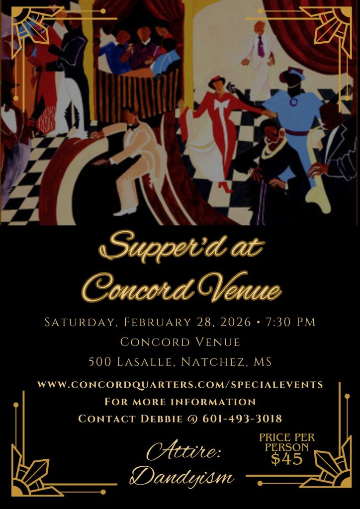 The public is invited to attend the “Supper’d at Concord Venue” to enjoy a delicious meal, live jazz, art exhibit, and a history presentation on “The Harlem Renaissance and the Supper Club.” The event, a celebration of Black History Month, will be held at 7:30 p.m., Saturday, February 28, 2026, at 500 LaSalle St. Admission fee is $45.