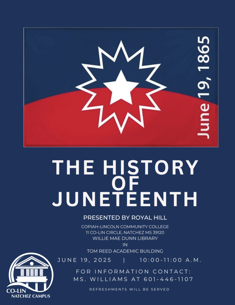 This event will take place on Copiah Lincoln Community College’s Natchez Campus, at the Willie Mae Dunn Library inside of the Tom Reed Academic Building, at 11 Co-Lin Circle, Natchez, MS from 10:00 AM to 11:00 AM.