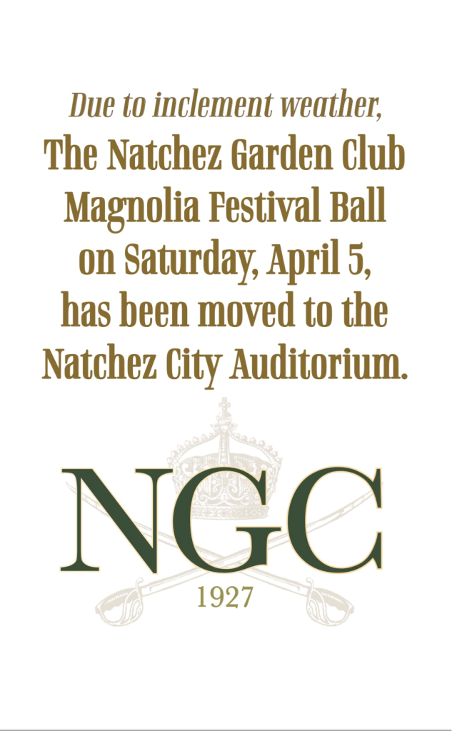 DUE TO INCLEMENT WEATHER, THIS EVENT HAS BEEN MOVED FROM MAGNOLIA HALL TO THE NATCHEZ CITY AUDITORIUM, LOCATED AT 207 JEFFERSON STREET.