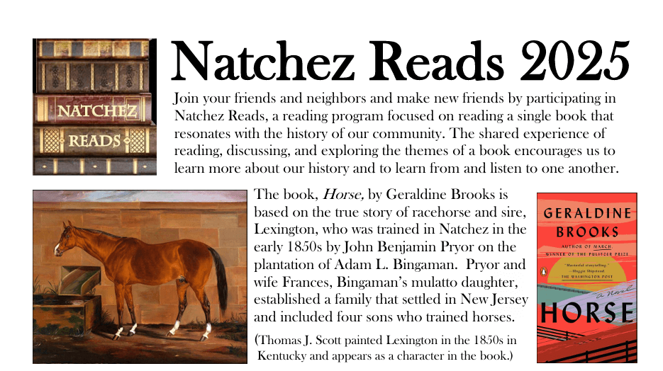 This is the first of four events sponsored by Natchez Reads 2025, a program focused on reading a single book that resonates with the history of our community. The book chosen for the read is Horse by Geraldine Brooks, based on the true story of racehorse and sire, Lexington, who was trained in Natchez.