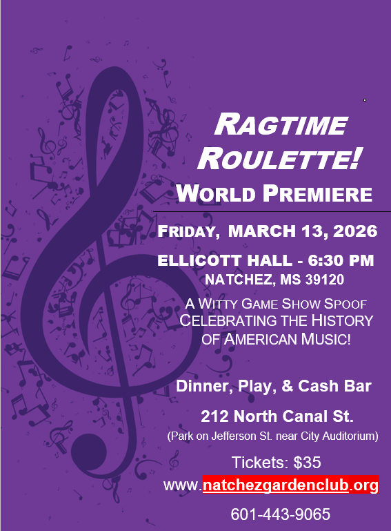 Ragtime Roulette, world premiere, is a witty game show spoof celebrating the history of uniquely American music. Written and performed by the Syncopation Sisters originally from Dallas, Texas, it will be part of a DINNER THEATRE experience at Ellicott Hall on Friday, March 13, 2026 starting at 6:30 pm. A cash bar will be available, and proceeds will help preserve the properties of the Natchez Garden Club. Admission price $35 per person.