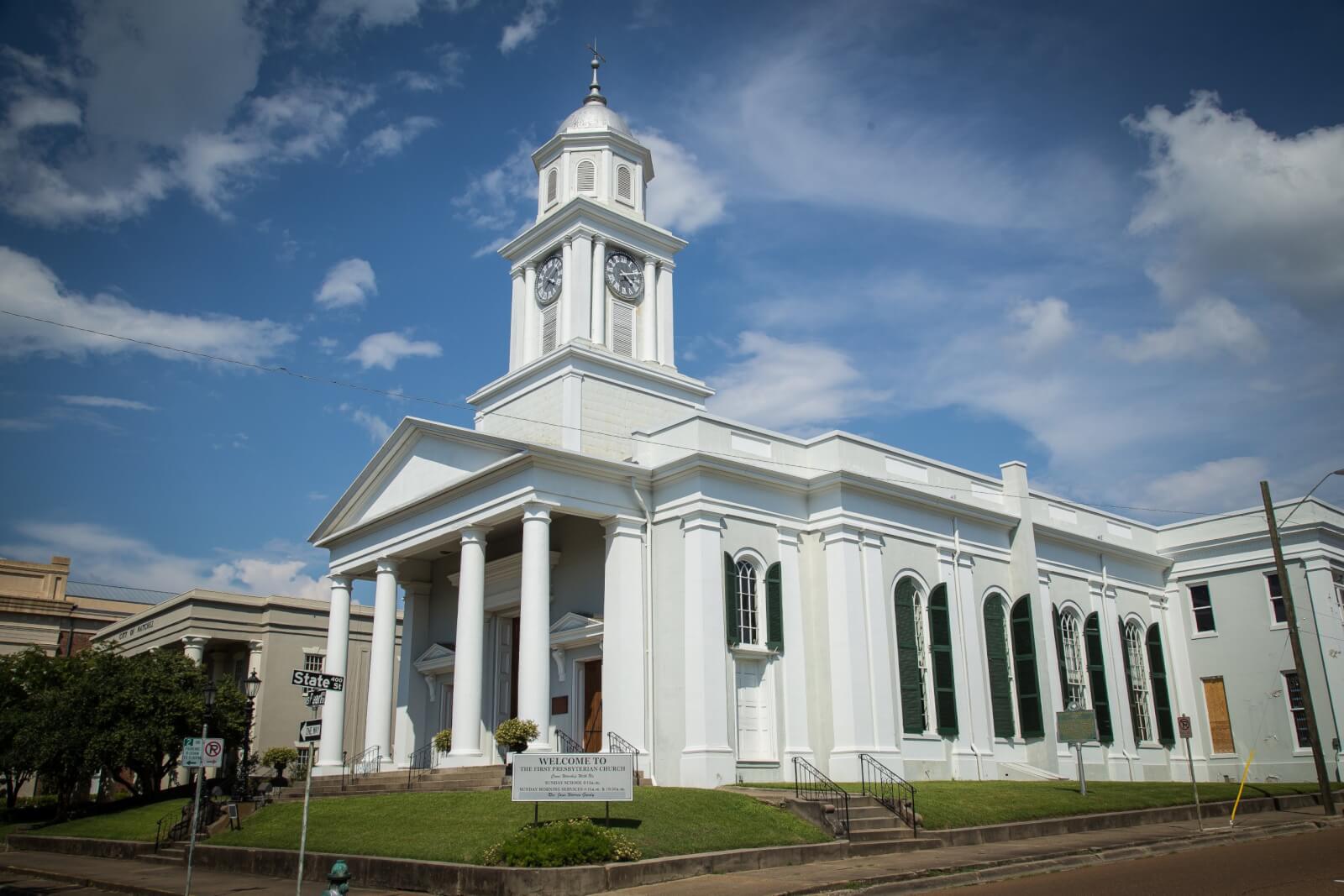 First Presbyterian Church, located at the corner of South Pearl and State Streets, is one of the finest examples of a Federal-style church in Mississippi. Constructed in 1828-1829 on the site of an earlier church, it is home to a congregation organized early in the 19th century. Stratton Chapel, added to the rear of the historic church in about 1900, is named for Joseph B. Stratton, pastor at the church from 1843 – 1893 and emeritus for 10 more years until his death. Stratton Chapel houses “Natchez in Historic Photographs”, a collection of astonishing photographs of early Natchez from the Gandy Collection. The exhibit is open to the public daily from 10:00 a.m. to 4:00 p.m. and visitors may tour the historic church through the chapel during those hours.